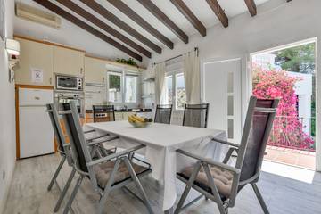 La villa à Benissa dispose de 2 chambres à coucher et peut accueillir 5 personnes. Elle est parfaite pour les familles et les amis qui souhaitent passer des vacances parfaites dans un quartier résidentiel tranquille. Distribution de la villa Avec 94 m², la villa est distribuée sur un étage, auquel on accède par un petit escalier, nous trouvons un salon avec canapé-lit, tv, deux ventilateurs de plafond et air conditionné, une kitchenette entièrement équipée, une salle de bain commune avec douche, une chambre à coucher avec lit double (deux matelas simples réunis dans le même sommier) avec air conditionné et un ventilateur. Une deuxième chambre avec deux lits simples avec ventilateur portable. A l'extérieur de la villa Au premier étage, il y a une terrasse avec accès à la maison, la piscine privée qui est accessible par une volée de marches avec un barbecue à gaz et une table à manger avec un auvent, un parasol et des chaises longues pour prendre le soleil. La piscine a des escaliers pour accéder à l'intérieur et est de 8X4 mètres Il est situé à 3,3 km de la plage de La Fustera (Benissa), 3 km du restaurant, 5,5 km de la ville de Moraira et 5,9 km de la ville de Calpe, 2,6 km du supermarché, 92,1 km de l'aéroport d'Alicante et est situé dans une zone idéale pour les familles ou les amis. Autres facilités Il dispose d'un jardin gravillonné, meubles de jardin, terrain clôturé, terr...
